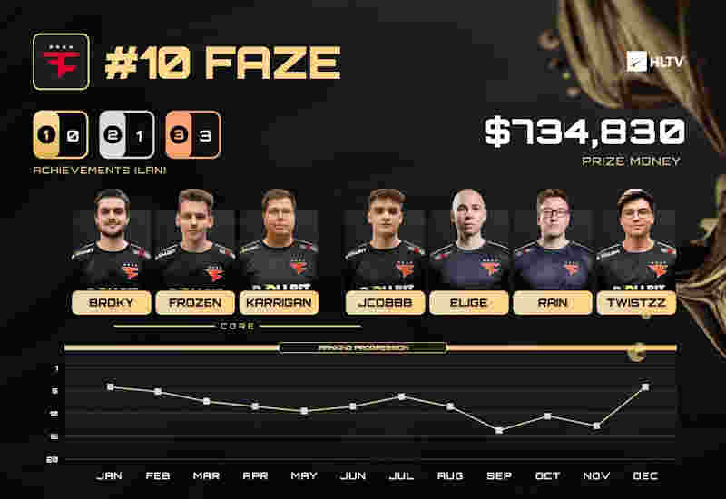 正是这次Major征程将FaZe锁定在年度前十。若非他们在BLAST.tv奥斯汀Major的阵容(核心并非broky、karrigan和frozen)不被计入该排名核心评定,他们本可位列第九。