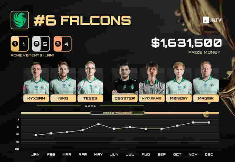 休赛期他们迎来了更多增援,即kyousuke。在IEM科隆站后,Falcons稳固跻身世界前五,连续五项赛事至少获得四强。战队还进入了StarLadder布达佩斯Major淘汰赛,这是他们在Major周期内迄今为止的最佳表现,为这个取得巨大进步的一年画上句号。从PGL布加勒斯特站起,在12项赛事中取得9次四强成绩,Falcons已非常接近闯入榜单前五。