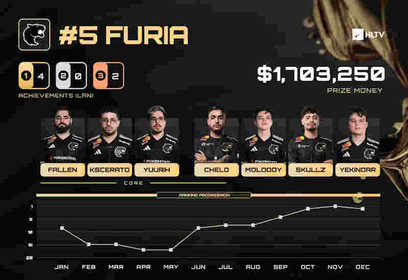 尽管在那场Major中止步八强,但这一年无论如何都已转变为成功的一年。年初的糟糕开局让FURIA相比榜单前列队伍有太多差距需要弥补,但他们在年末的强势冲刺,以及在IEM成都站的巅峰表现,足以让他们超越Falcons,位列第五。