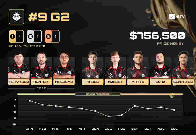 PGL布加勒斯特后,m0NESY的离队使G2的处境雪上加霜。引入hades作为赛季末的过渡选手后,G2表现尚可,赢得了几场比赛,甚至险些闯入BLAST.tv 奥斯汀Major淘汰赛。但若按此轨迹发展,他们很可能无缘此榜单。