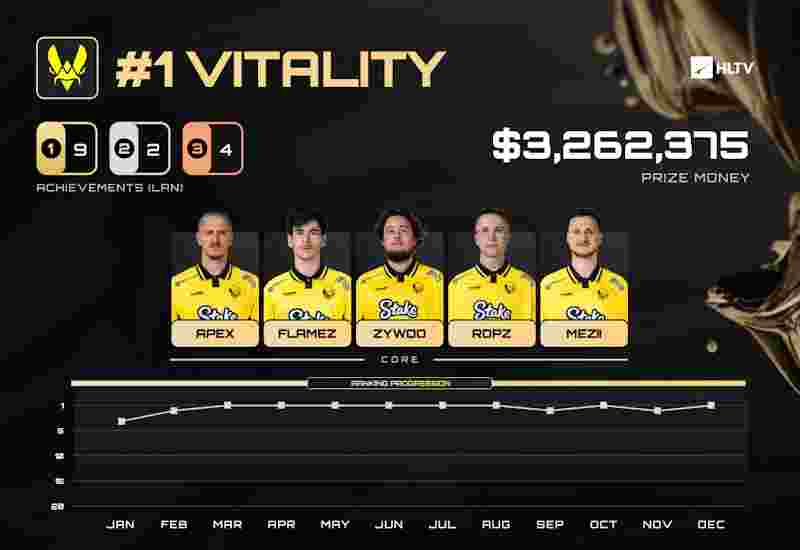 Astralis阵容在2019年实现以来再无战队做到。在2025年的16项大型赛事中,Vitality九次夺冠(其中两次为 Major),仅有一次排名低于四强。他们作为年度最佳战队的地位无可争议。