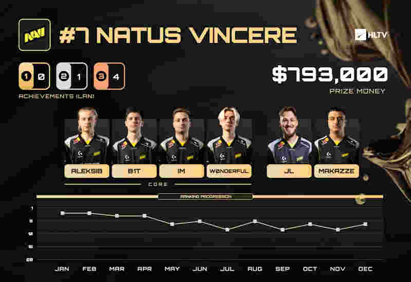NAVI的稳定性虽不如前,但在年底前仍取得了不错的成绩,最引人注目的是闯入StarLadder布达佩斯Major四强,这是他们全年最佳战绩。正是这一成绩让他们以微弱优势力压Aurora,位居榜单第七。两队几乎并驾齐驱,但NAVI的巅峰表现略胜一筹。