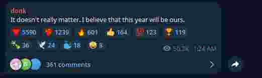 donk在无缘2025年度TOP1之后,在自己的电报社交媒体上发布了一条新的动态,