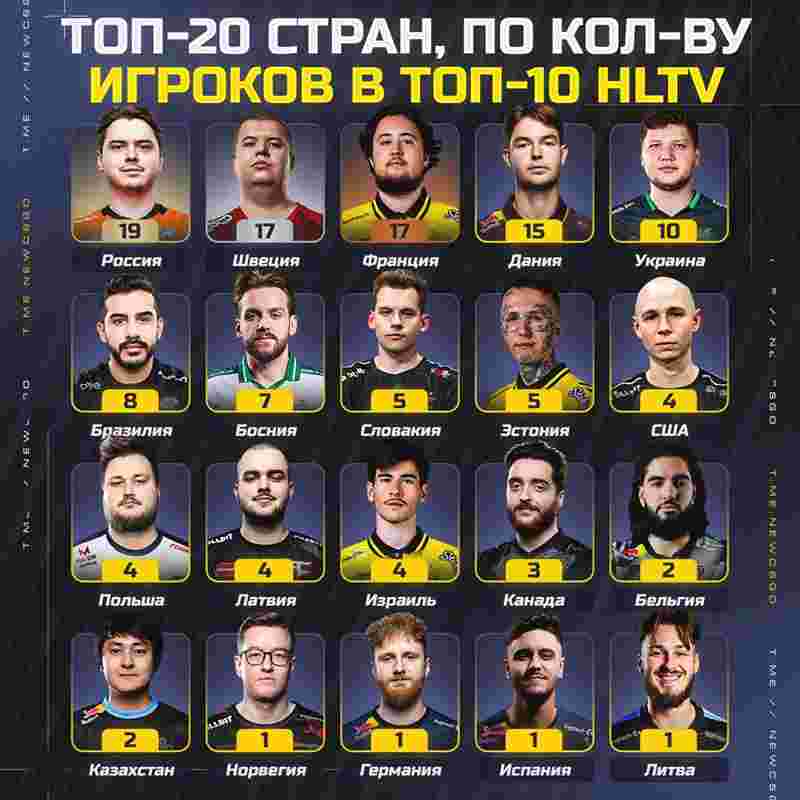 从榜单中来看,俄罗斯是顶尖选手的主要摇篮。自2013年HLTV排名系统创立以来,俄罗斯选手跻身年度前十的次数多于其他任何国家。