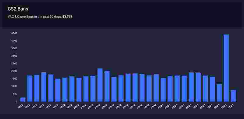 根据相关数据统计,过去30天,V社总计封禁了53774个账号,其中2026年1月10日当天的封禁账号数量则是明显高于以往。