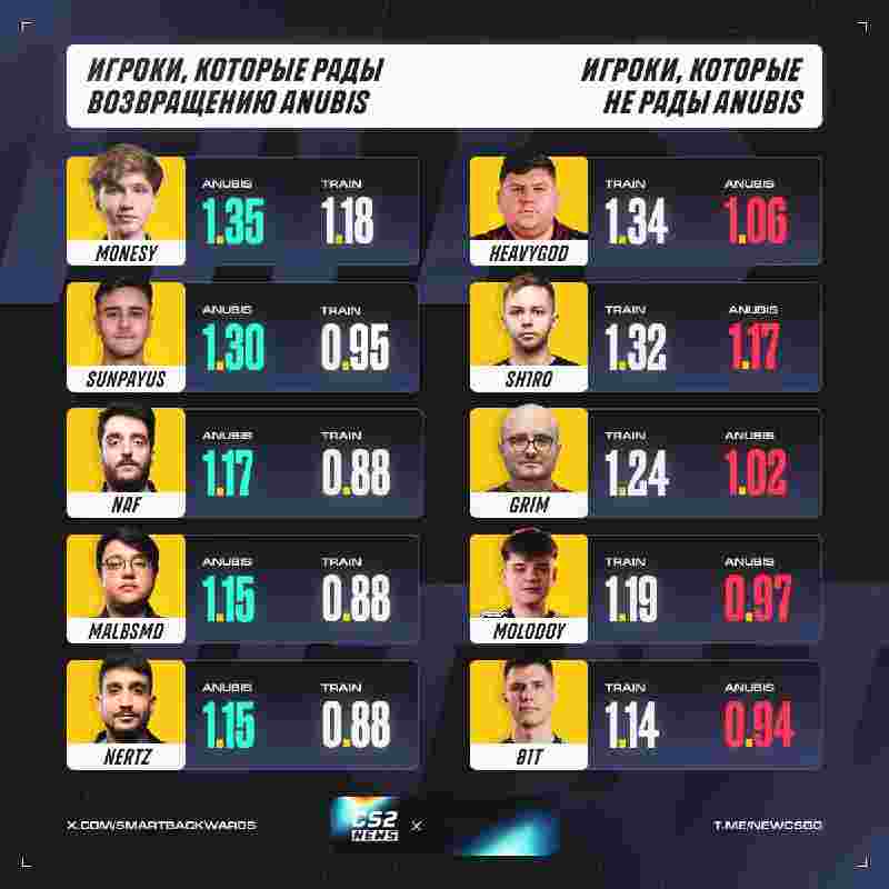 前几日,V社官宣了Anubis替换Train的决定,Anubis将会在今日开打的BLAST赏金赛S1 2026上正式登场。这一地图池的更换对谁更有利呢?又是哪支队伍大受影响?国外媒体对Anubis和Train上Rating前五选手进行了对比,一起来看看吧!