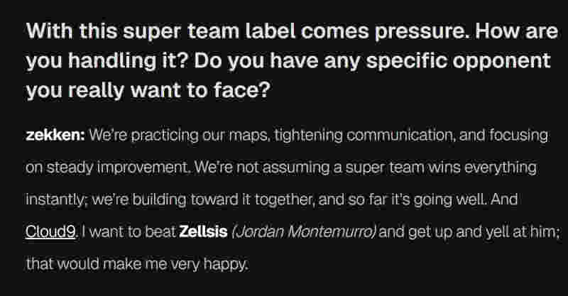 zekken:"我们正在练习地图,加强沟通,专注于稳步的提升中。我们并不认为所谓的"银河战舰"是能立刻赢下所有比赛的。我们正在共同努力朝着这个目标前进,而目前为止一切顺利。至于