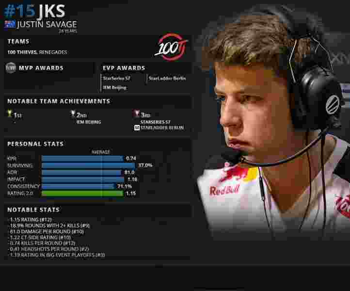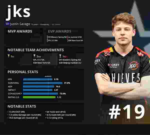 团队荣光:从早年在Renegades时期的崛起,到后来加入Complexity、100 Thieves等国际顶尖战队,jks始终是队伍最可靠的 “定海神针”。他曾率队斩获包括ESL Pro League、DreamHack大师赛在内的多项国际赛事冠军,与队友们一起高举奖杯、沐浴金色雨的画面,早已成为CS历史上的经典瞬间。