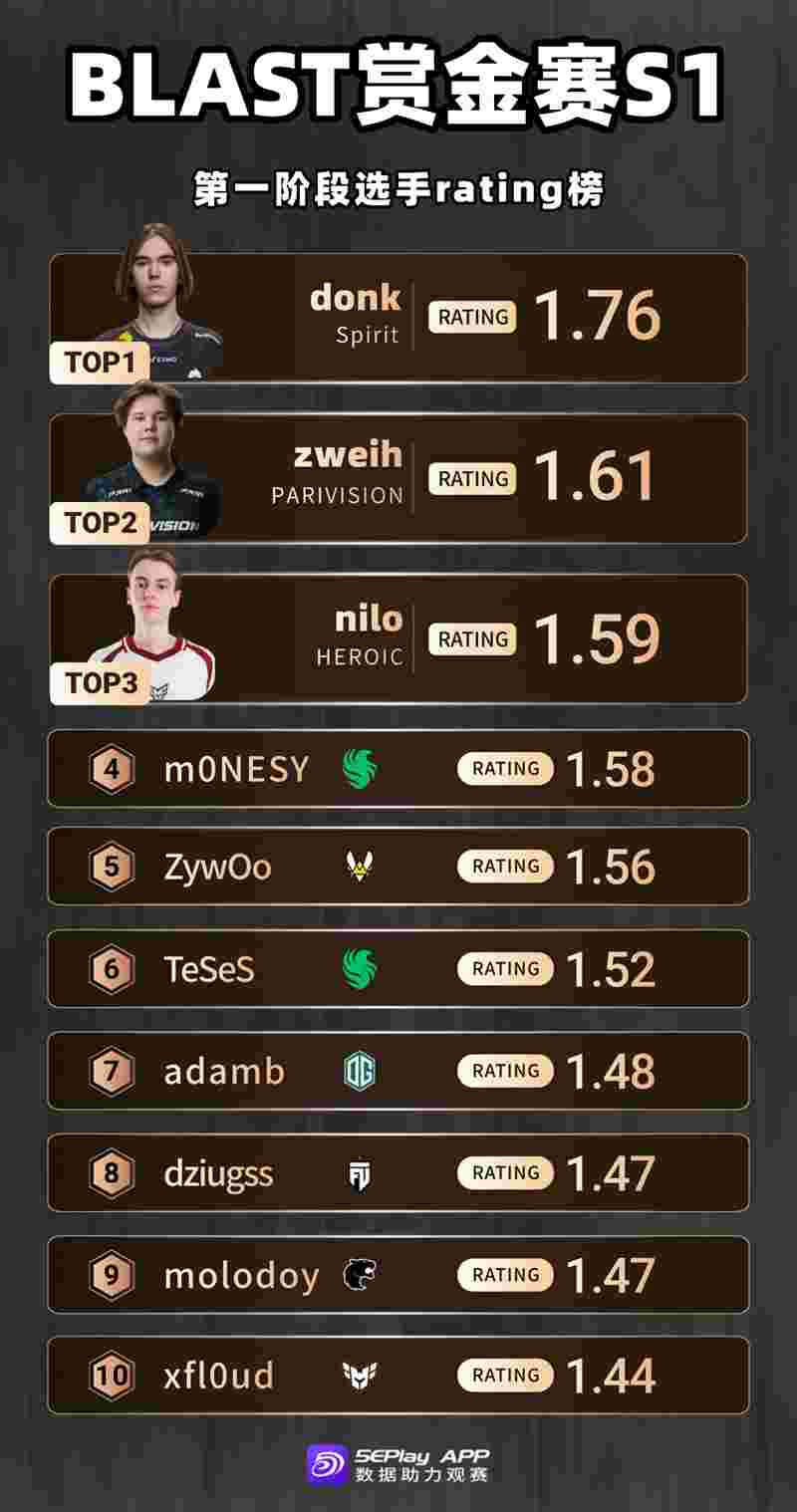 HEROIC的nilo,他也是凭借着某场次2.56的超高rating成功跻身前三。m0NESY和ZywOo两位明星狙击手位列四、五名。