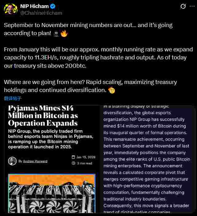 Ninjas in Pyjamas首席执行官Hicham Chahine则是宣布,公司自2025年9月成立挖矿部门以来,在近三个月通过挖矿业务进账超过1400万美元。