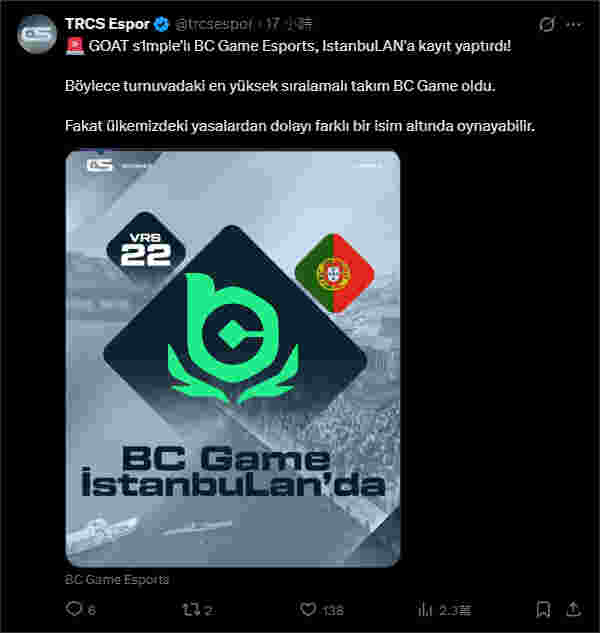 不过仅仅几个小时,TRCS Espor就报道称BC.Game因故将要退出本次赛事。有分析称大概率是因为土耳其的法律问题,导致BC.Game需要变更队名。