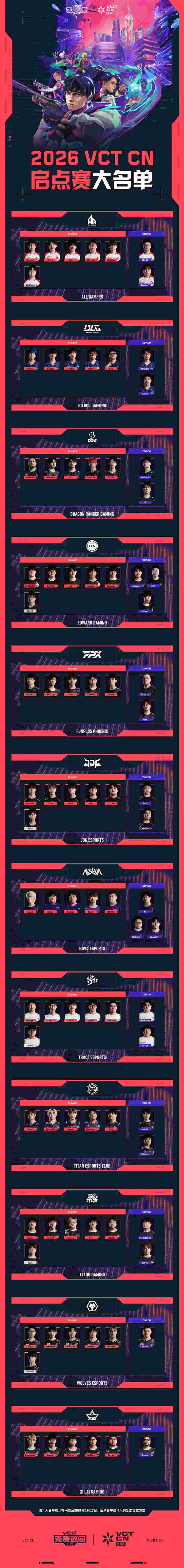 2026 VCT CN启点赛将于1月22日-2月9日正式打响,十二支参赛队伍现已集结完毕。无畏契约电竞官方公布2026 VCT CN启点赛队伍大名单,如下图所示。