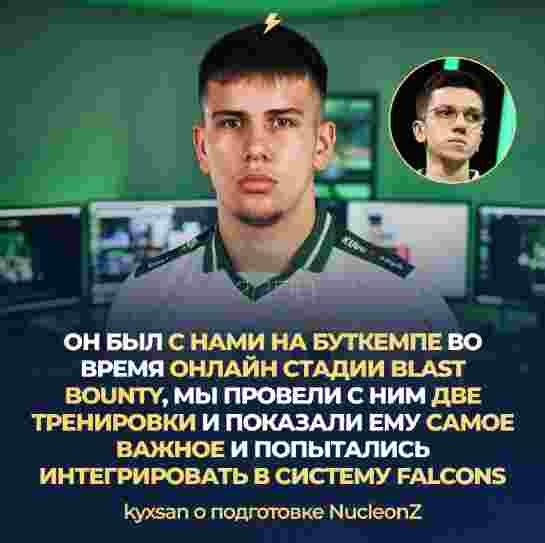 同时,kyxsan还透露了新人NucleonZ的训练情况:“在BLAST赏金赛线上赛期间,NucleonZ和我们一同进行了集训。我们带他进行了两场训练,向他展示了最关键的内容,并尝试将他融入Falcons的战术体系。”
