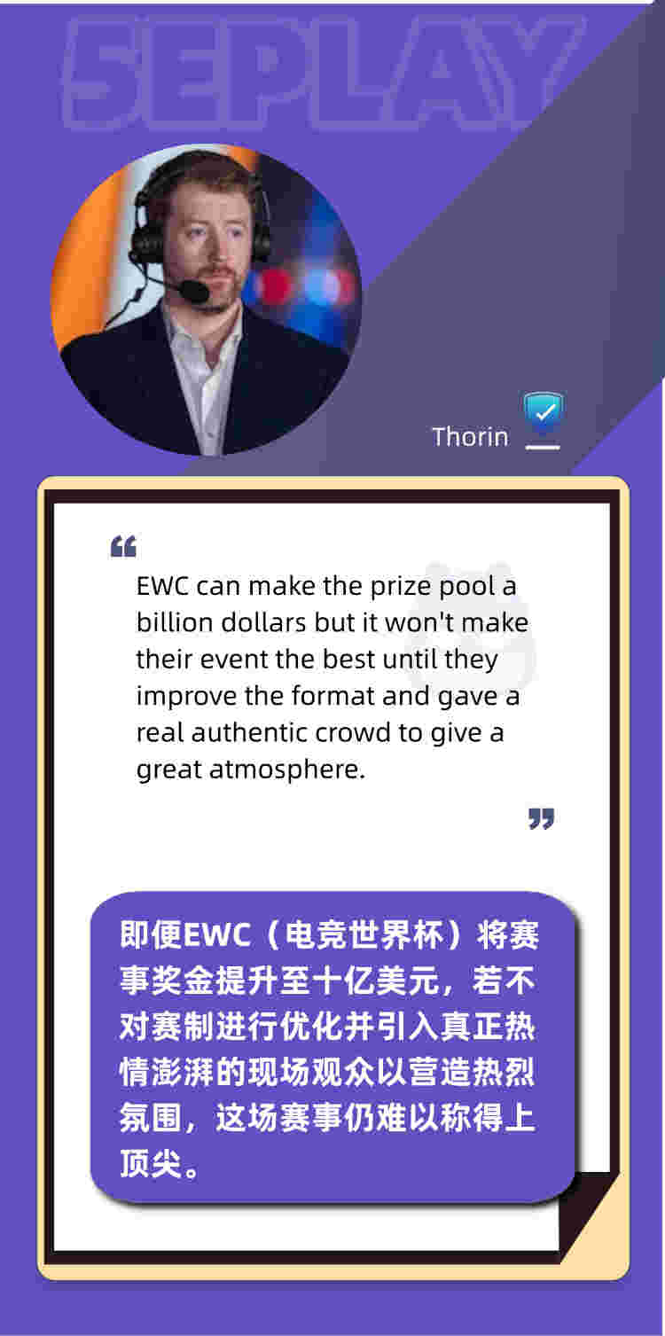 Thorin认为,即便EWC把奖金提升到10亿美元的级别,如果赛方不针对赛制进行优化,不去举办符合观众愿望的赛事,它仍不能被称为一项顶尖赛事。EWC是继WCG、WESG后在如今仍然坚持走综合项目的大型电子竞技赛事,今年已是EWC连续第三年举办。