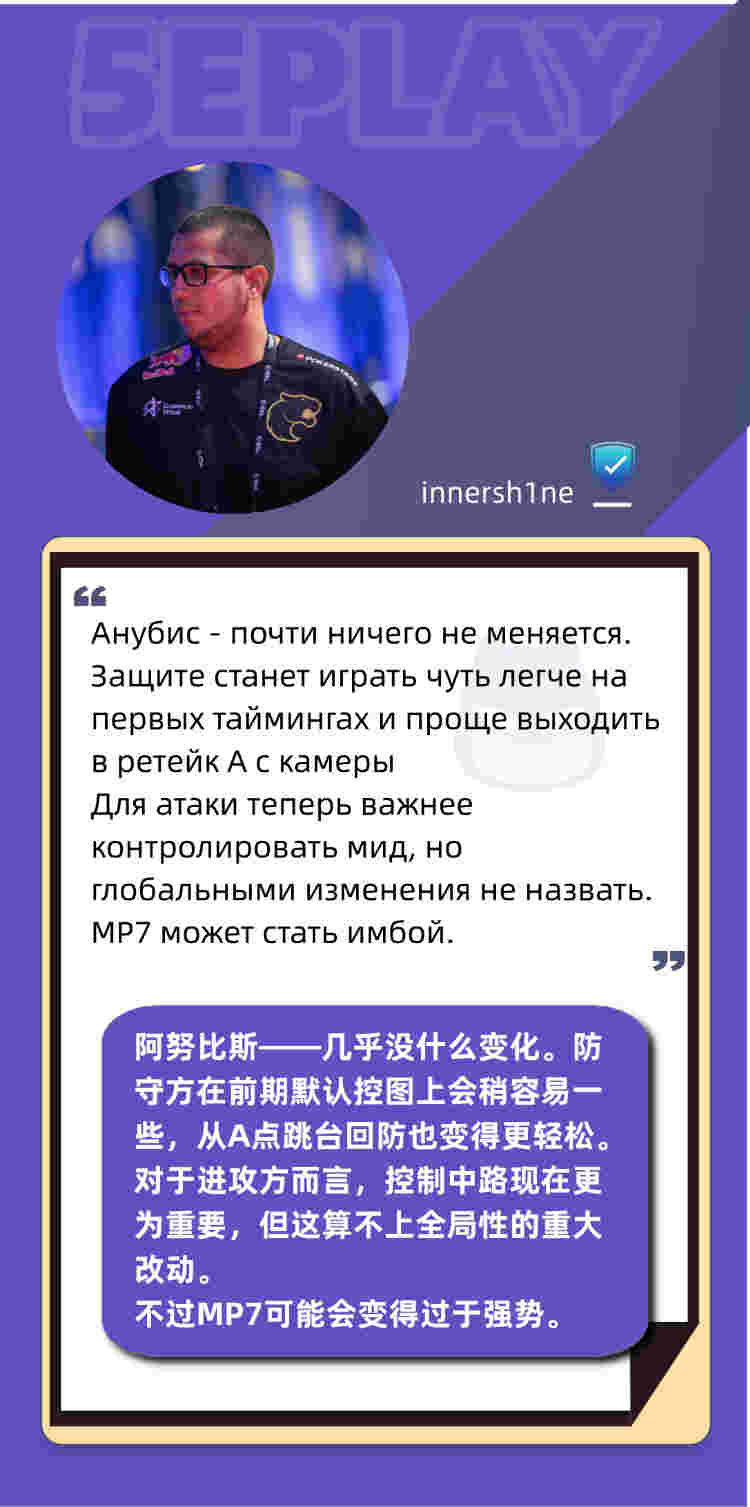 “阿努比斯——几乎没什么变化。防守方在前期默认控图上会稍容易一些,从A点跳台回防也变得更轻松。对于进攻方而言,控制中路现在更为重要,但这算不上全局性的重大改动。