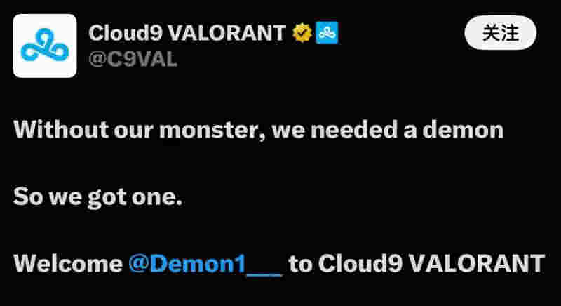 C9官推写道:在我们原有的“怪物”暂时缺席的情况下,我们需要一位“恶魔”——于是他来了。欢迎Demon1加入Cloud9无畏契约。
