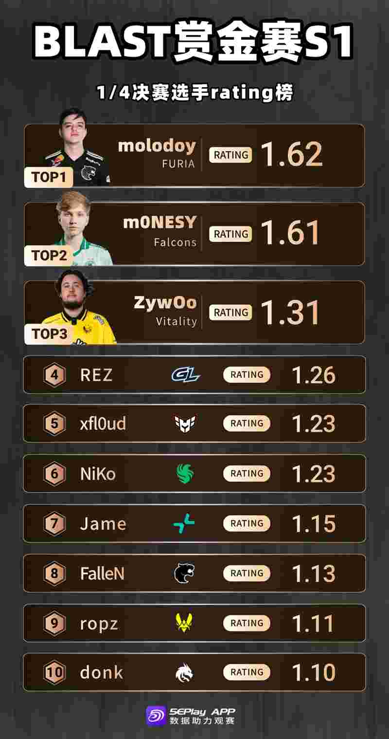 molodoy在1/4决赛发挥依旧相当耀眼,几乎算是以一己之力带领FURIA击败了HEROIC,三张图打出了平均1.62的超高rating,位列榜单第1。排名第2的是Falcons的“大孩”m0NESY,在“二孩”kyousuke缺席的情况下为队伍提供着稳定的输出,与排名第6的NiKo久违地组成了队伍的“火力双子星”,艰难战胜Liquid晋级。而排名第3的则是稳定Carry的ZywOo,虽然1.33的rating距前二相差甚远,但在开年Vitality全员状态不佳的情况下,作为全队顶梁柱依然在扛着队伍前行。