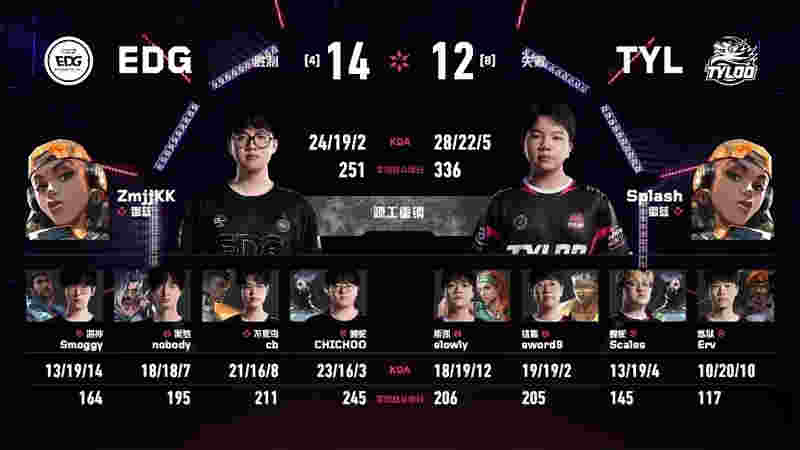 下半场EDG赢下手枪局后,splash立即一记四杀完成翻盘。第15回合,TYL出现配合失误,EDG抓住机会追回一分。第18回合,ZmjjKK与CHICHOO在浴室拿下三杀,EDG连追四分将比分反超。比赛陷入焦灼,第23回合slowly混烟打出双杀,TYL在决斗位阵亡后仍顽强进点,EDG二打三回防失败。第24回合TYL进攻耗时过长,最终rush被EDG在混战中守住。比赛进入加时,EDG稳扎稳打连下两分,最终以14-12锁定胜局,总比分2-0晋级。