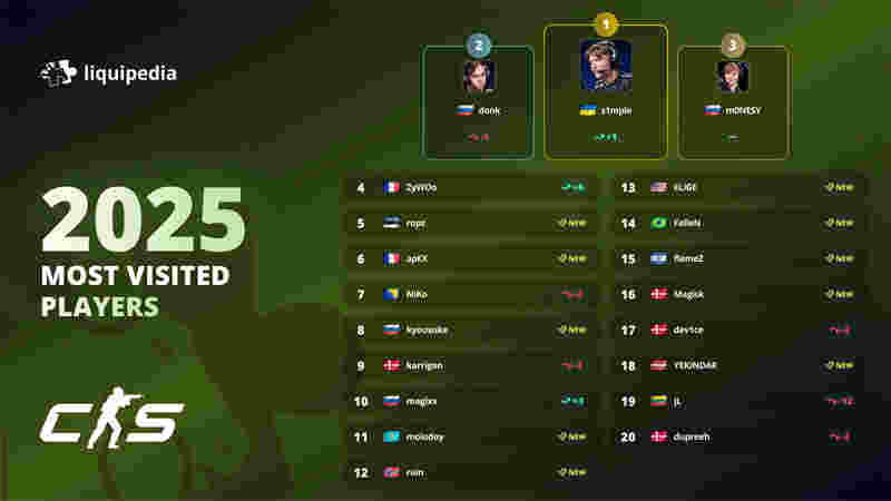 根据Liquipedia官方发布的社媒统计数据,s1mple的个人页面在2025年成为该平台CS2类别中访问量最高的选手页面。donk和m0NESY分列二、三位。