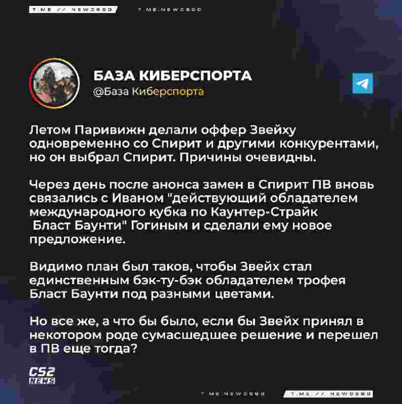 Spirit及其他队伍,但他最终选择了Spirit,原因显而易见。在Spirit宣布阵容变动后隔天,PV再次联系了现役BLAST赏金赛2025 S2冠军得主zweih,并向他提出了新邀约。
