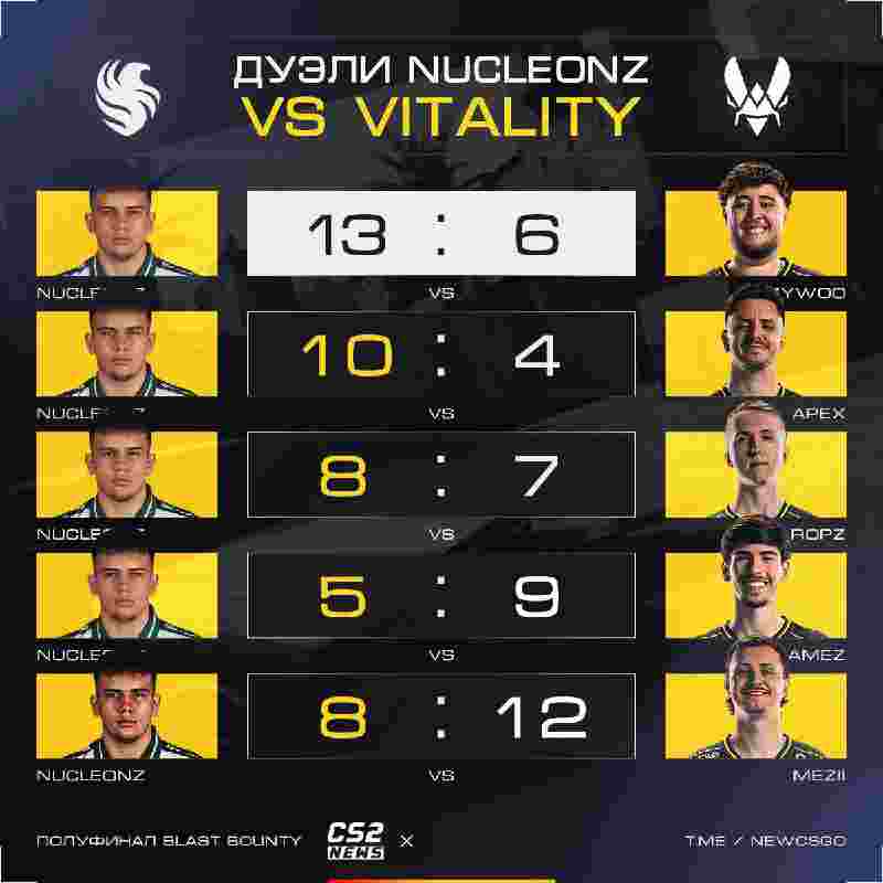 Vitality比赛中,Falcons的替补选手NucleonZNucle对位TOP1 ZywOo打出了13-6的压制数据。