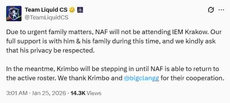 Liquid在X官方账号宣布,NAF将因“紧急家庭事务”缺席队伍下一站赛事——IEM克拉科夫站,德国步枪手Krimbo将顶替其出战。