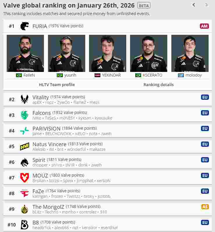 Spirit,他们在IEM卡托维兹2024、IEM科隆2025等赛事上都完成过这一成就。经此一役,PARIVISION的V社世界排名已来到了世界第四位,在该赛事线上赛阶段开始前,PARIVISION的V社排名仅有16名。