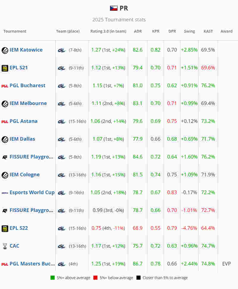 GamerLegion。他与REZ迅速成为战队核心火力,助队伍稳居世界前20。PR在多次赛事中展现残局影响力,尤其在PGL布加勒斯特大师赛以1.25评分收获EVP。但队伍狙击位的不稳定限制了成绩突破,他最终以年均1.12评分结束赛季,未能跻身TOP 30。