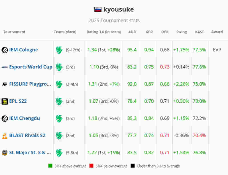 如众人所料,kyousuke在2025年迎来突破。上半年他率Spirit Academy在BB LanDaLan两站赛事中夺冠,分别打出1.28与1.54的恐怖Rating。夏季转会窗他加盟