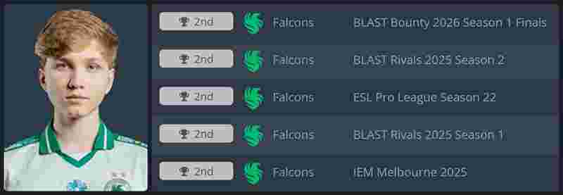 自m0NESY于2025年春季加盟Falcons以来,战队已经五次闯入大赛决赛,遗憾的是,Falcons在这五场决赛中全部失利。