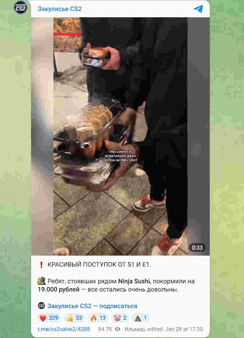 事情就发生在今天的早些时候。当时,一群粉丝正在一家寿司餐厅外等待,餐厅的一名工作人员走出来,将食物交给了他们,并说明这是s1mple和electronic送来的礼物。随后,同样的场景再次出现,粉丝们收到了总共约15份寿司。