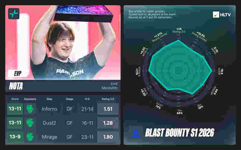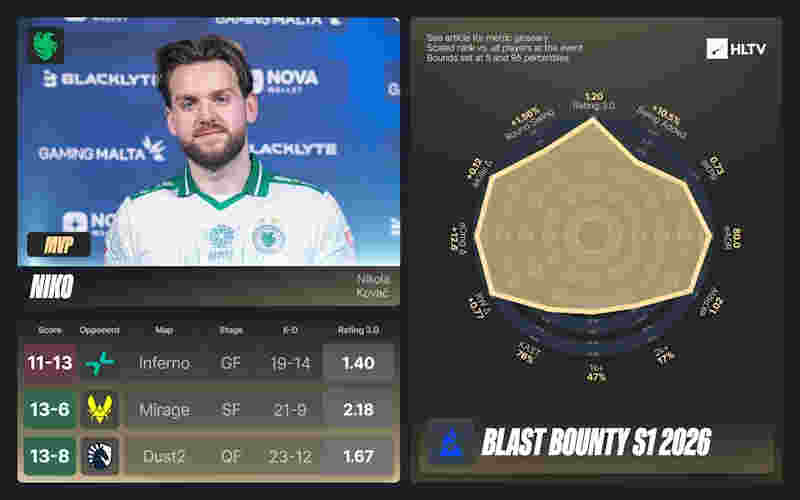 尽管在决赛开局阶段状态较慢,且队友m0NESY完全隐身,但NiKo凭借在四分之一决赛、半决赛(Mirage决胜图中CT方3.26评分、177ADR)和决赛三阶段均达峰值的表现,最终在竞争中脱颖而出。值得注意的是,在HLTV评分体系中,此次MVP的含金量低于许多采用更长赛制或拥有更突出个人表现的EVP奖项。
