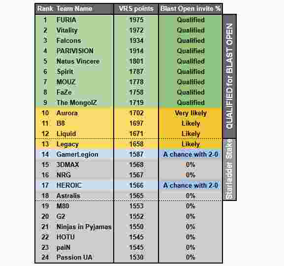 根据外媒VRS爱好者Udkund发布了一则有关BLAST鹿特丹公开赛站直邀名额的VRS分析,该站直邀名额与目前在进行中的IEM克拉科夫第一阶段比赛息息相关。