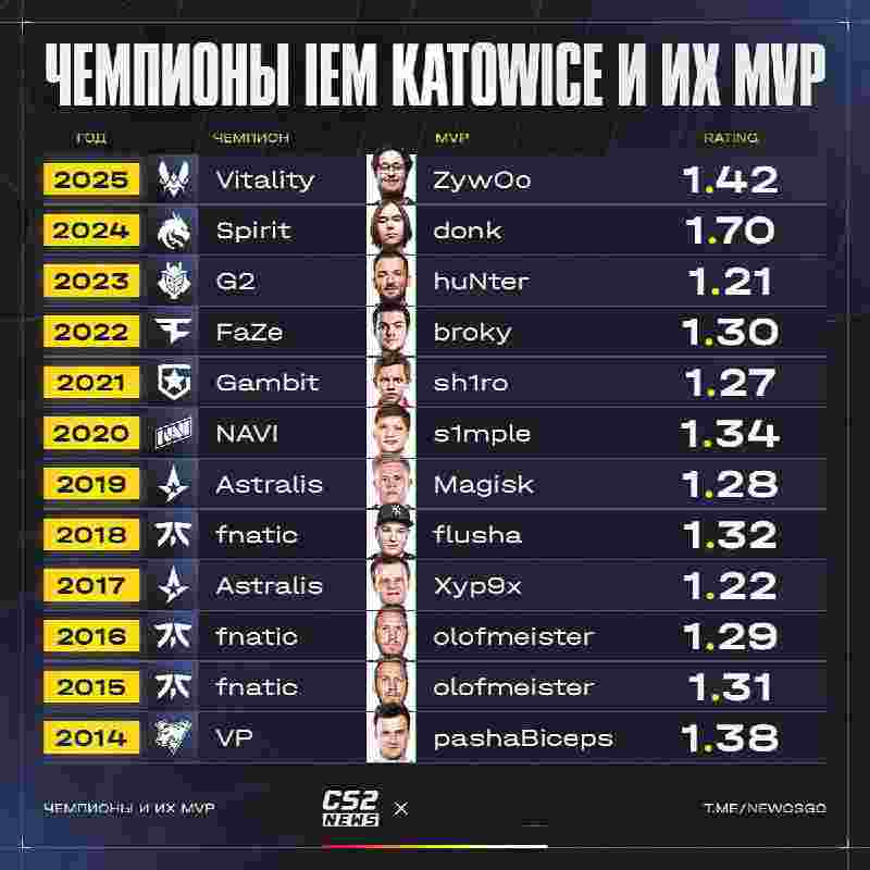 由于场馆大小问题,IEM卡托维兹系列赛事从今年开始迁移至克拉科夫。这一赛事一直都是除Major外含金量最高的比赛之一,俄媒CS2NEWS也盘点了从2014年开始,历届IEM卡托维兹的冠军及MVP获得者。