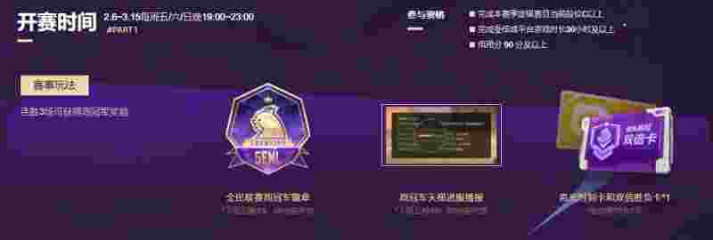 2月6日至3月15日,每周五/六/日晚 19:00-23:00(共计六周),玩家可以通过单排或组排的方式自行参赛。