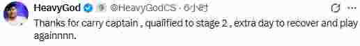 HeavyGod:“感谢队长带飞,成功晋级第二阶段!多了一天休整时间,然后接着冲!”