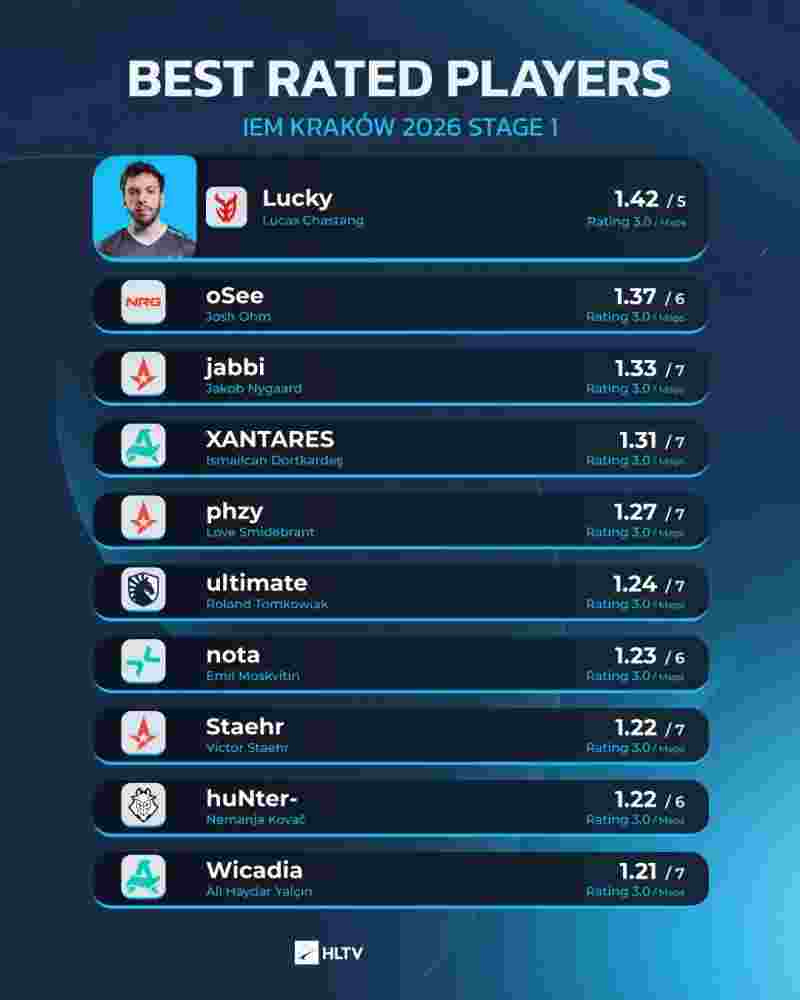 随着IEM克拉科夫站2026第一阶段结束,选手个人数据榜正式出炉,多位选手打出了爆炸级表现。