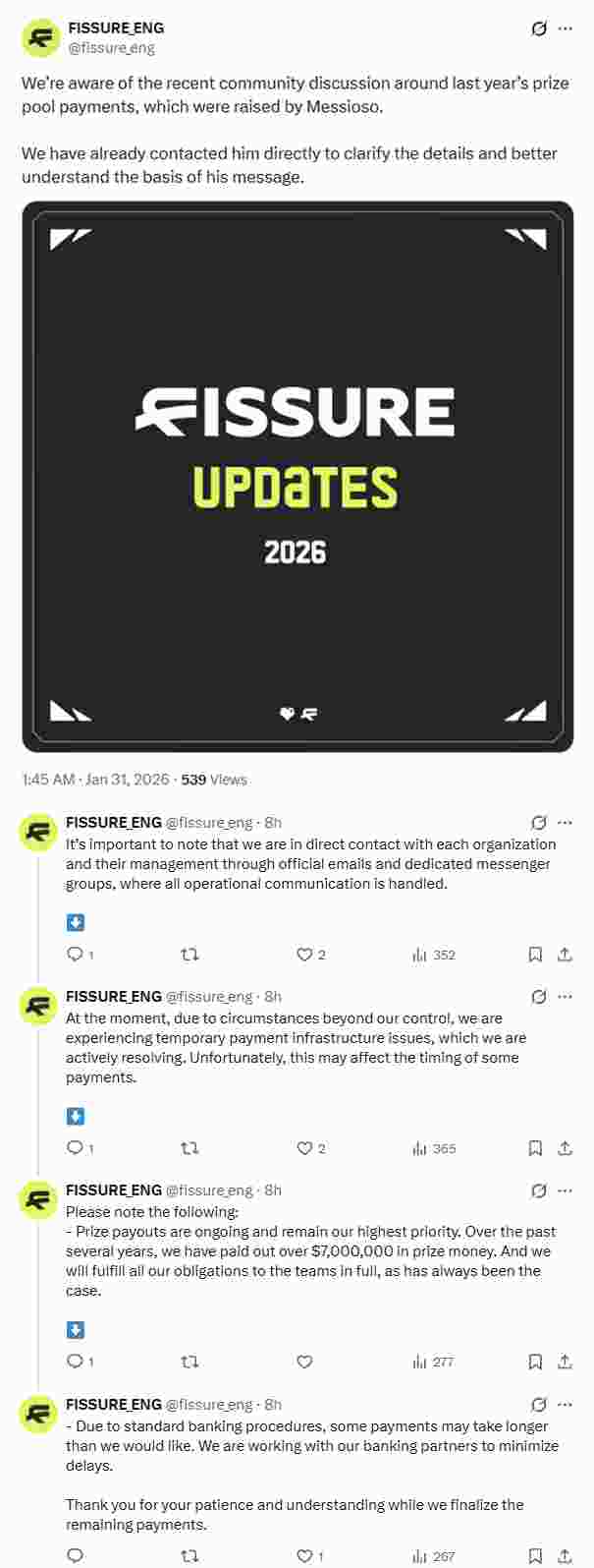 100 Thieves运营主管messioso转发Udkund对于FISSURE赛事是否会举办的推文时透露:“就目前情况来看,想要从他们那里拿到去年赛事的奖金极为困难。很多队伍甚至连对方的回复都收不到,截至目前,所有奖金都早已逾期未付。”