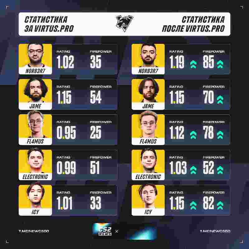 Virtus.pro战队踢掉的选手,在加入下一支队伍后,个人数据都出现了大幅提升。其中n0rb3r7n0rb、FL4MUS提升最大,他们的Rating进步多达0.15,而Jame则是Rating未变,火力值提升了不少。