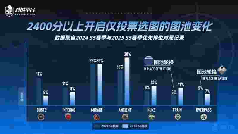 5E对战平台的排位地图池分布特征,与当下的官匹生态高度相似: