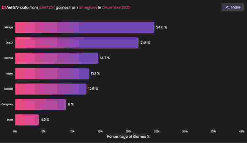 从外网知名数据网站leetify统计的数据来看,同期(2025年12月)CS2 官匹 Premier 模式共进行了近 390 万场对局,其中"老三张"的选用占比高达60%;而余下的四张地图中,除了 Train 的选取率较为落后,整体呈现较为平均的选取率。