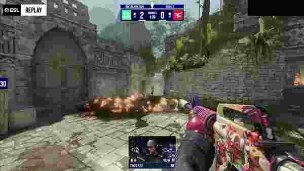 BC.Game先做进攻方。手枪局,CT的双A小见人反刷被s1mple一把P250双杀瞬秒,放下雷包只剩寒王一人一打三失败,手枪局BC.G拿下。
