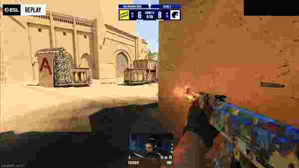 次回合CT强起赌区失败只能eco。来到上半场第一个长枪局,molodoy大狙快抢B小拿到首杀,土匪默认过后给夹B烟佯攻,实则A1二楼同步,虽然清空包点,但FalleN和KSCERATO各自混死一人,剩个中路准备绕后的Aleksib只能保枪,比分2-2。随后双方在比分上你来我往。第八回合,CT顶中路一换二,A二楼走单的b1t被发现后也难逃一死,留给土匪的二打四残局,CT锁死对手位置不敢操作,Aleksib和makazze双人五杀,比分再次战平4-4。第十回合,枪械不佳的土匪选择爆弹提B,虽然包点教父马枪一个没打,但给沙发的狂哥做嫁衣一把AK五杀Ace打崩NAVI经济,比分6-4。上半场最终局,土匪道具数量不多选择爆弹夹B,包点二换一,B小molodoy大狙双架偷到一人,队友超市回防成功拿下,半场比分定格在8-4,FURIA暂时领先。