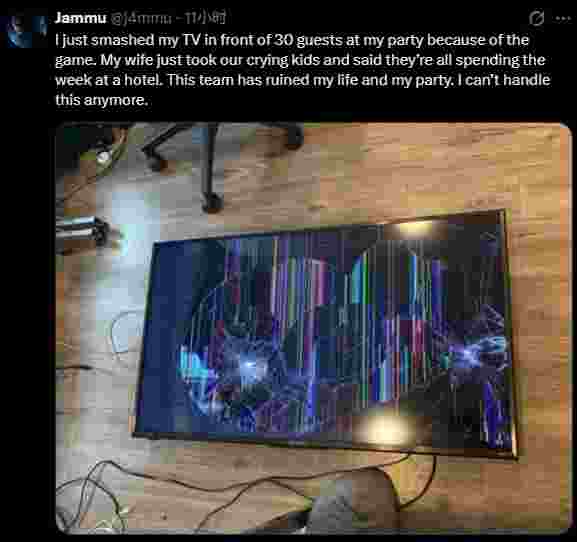 推特用户Jammu赛后发布了动态向NaVi战队抱怨道:“我刚刚在派对上守着30位客人的面儿砸碎了电视,就因为那场比赛。我妻子带着哭泣的孩子们离开了,说他们这周都会住在酒店。这个队伍毁了我的生活和我的派对,我再也受不了了。”