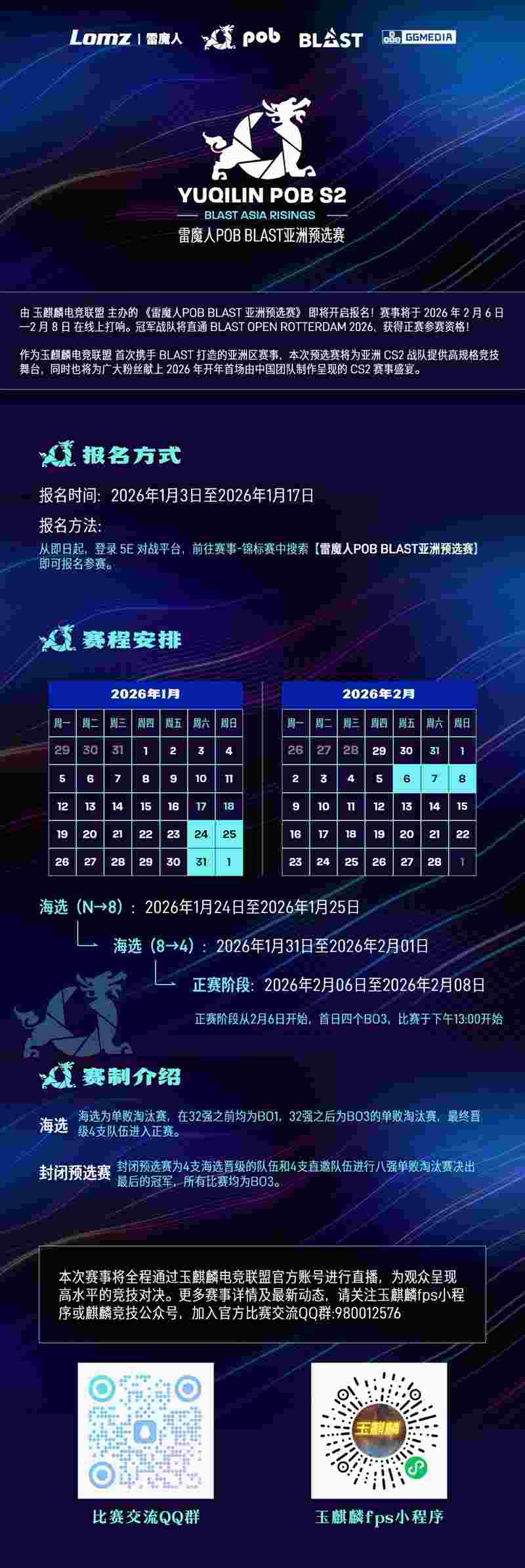 正赛的参赛战队以及赛程将在2月4日公布,本次Yuqilin POB S2 - 雷魔人 POB BLAST 亚洲预选赛的胜者,将获得晋级3月18日开战的 BLAST鹿特丹公开赛的宝贵席位。