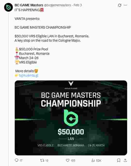 BC.Game宣布将于3月举办比赛,该赛事由JB职业联赛的赛事运营方Vanta承办。