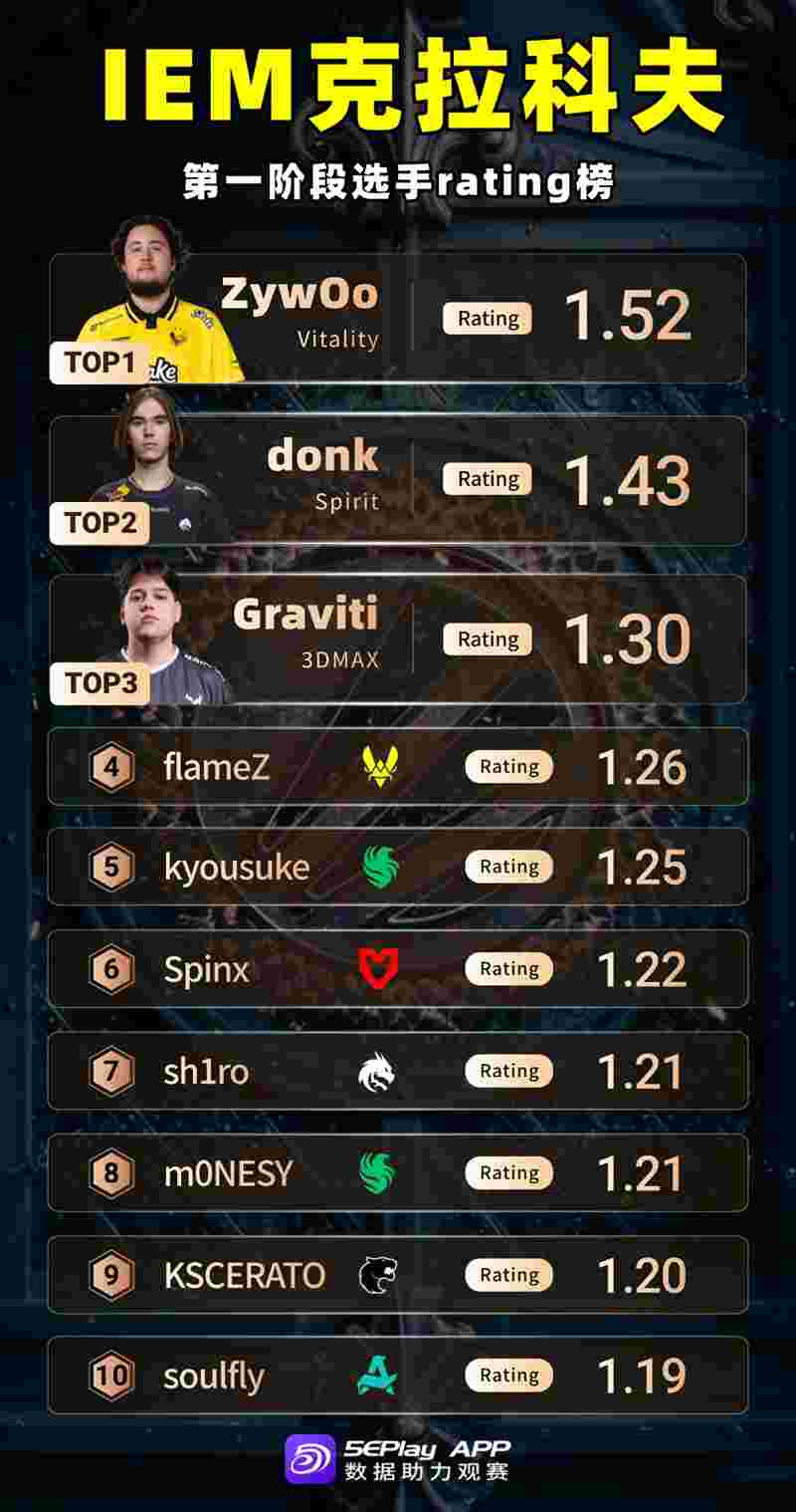 ZywOo以1.52的rating成功统治榜单,比排名第二的donk(1.43 rating)高出了0.09。第三名是