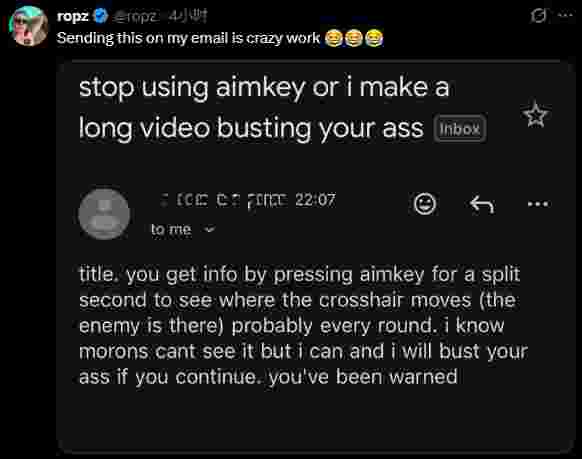 ropz将收到的威胁邮件截图分享出来,发送者称其使用瞄准键获取对手位置信息。