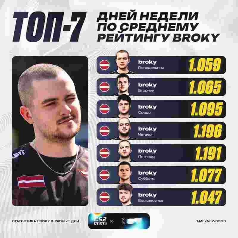 FaZe狙击手broky的一项个人数据,他们将箱神每周一到周日参加比赛的rating进行了横向对比。最终不出所料,果然星期四的broky最厉害!