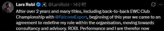 “在超过两年时间并斩获包括连续两届EWC俱乐部冠军在内的诸多荣誉后,今年年初我们与Falcons达成共识,重新定义我在俱乐部内的角色,转向顾问咨询方向。因此,自2025年底起,ROBL Performance团队与我已退出对战队及选手的日常参与,现作为非独家顾问为管理层提供支持。